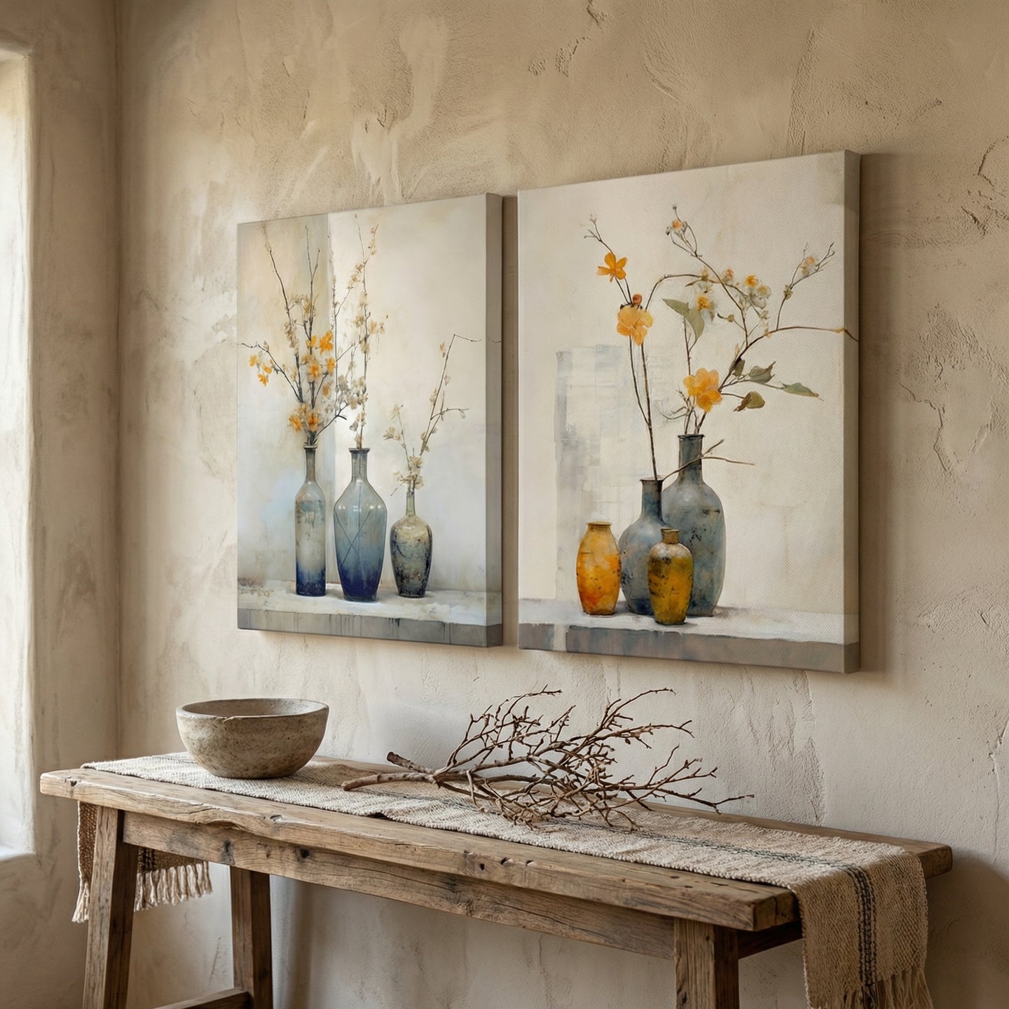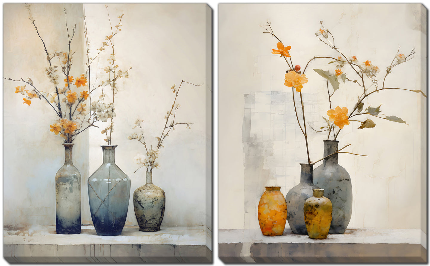 Set of 2, hand embellished canvas art gallery-wrapped on pine stretcher bar frames presented in an open-faced box
