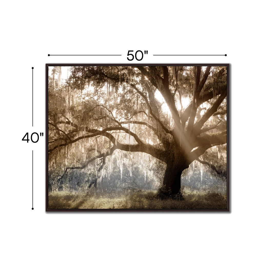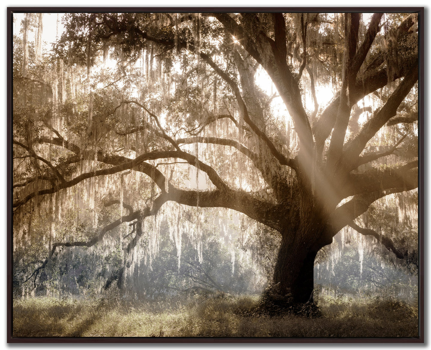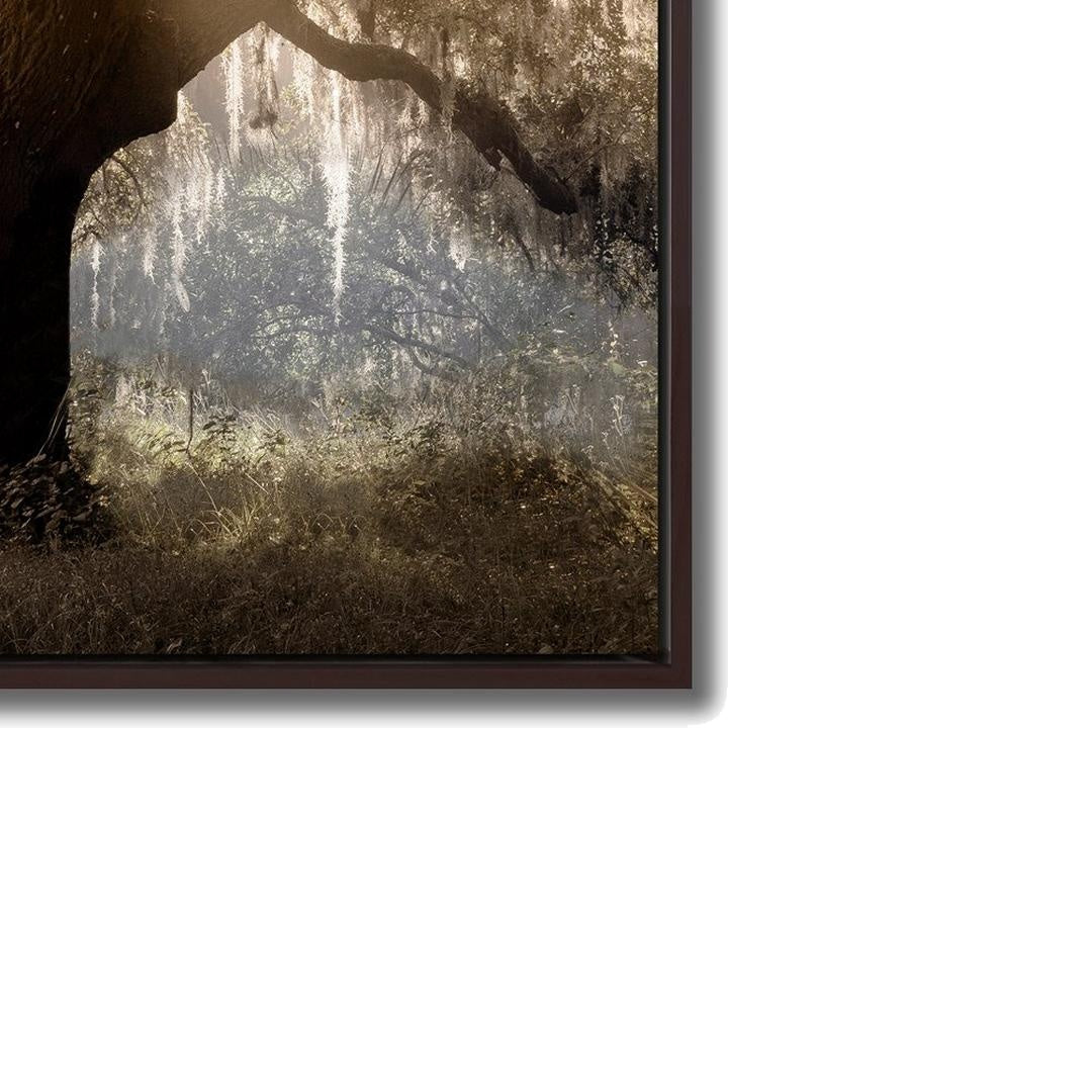 Printed canvas art in a brown floating frame